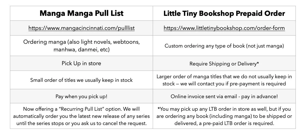LTB is different than the Manga Manga pull list! Order your books through LTB if you want manga SHIPPED to your door, DROPPED OFF to your house, sent to a friend, OR if you want to custom order any books that are NOT manga. If you are not looking for any of these things, then continue to use the standard Manga Manga pull list in store or on our website. This process will not change!